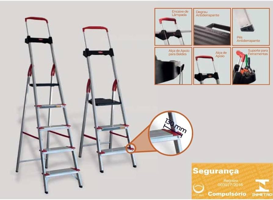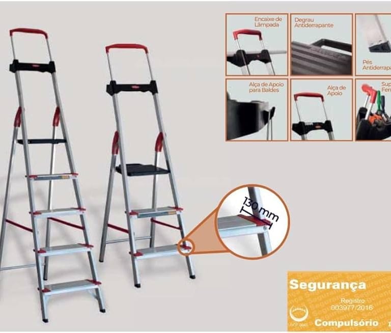 São escadas leves e resistentes, suportam até 150kg, além de possuir porta ferramentas e suporte para balde e os degraus mais largos do mercado 13cm. Tornando-a mais segura e confortável.